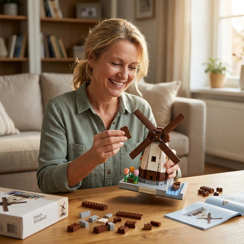 This beautifully crafted windmill set captures the charm of the Netherlands—complete with rotating blades, blooming tulips, and a peaceful countryside scene.